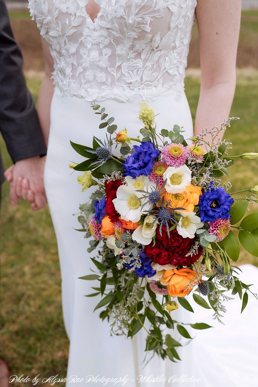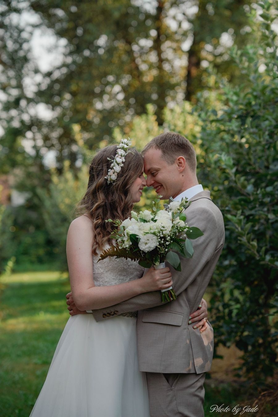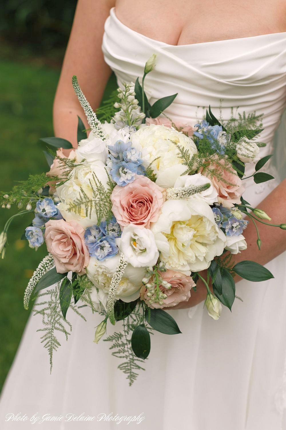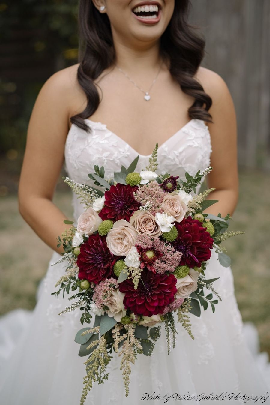 A radiant bride’s look of awe and admiration when she holds her stunning bouquet for the first time,
